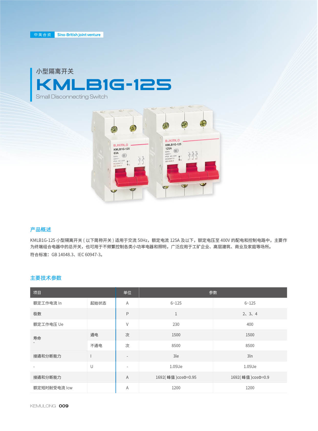 KMLB1G-125 小型隔离开关(以下简称开关)适用于交流 50Hz,额定电流 125A及以下,额定电压至400V 的配电和控制电路中,主要作为终端组合电器中的总开关,也可用于不频繁控制各类小功率电器和照明,广泛应用于工矿企业、高层建筑、商业及家庭等场所。符合标准:GB14048.3、IEC60947-3。
