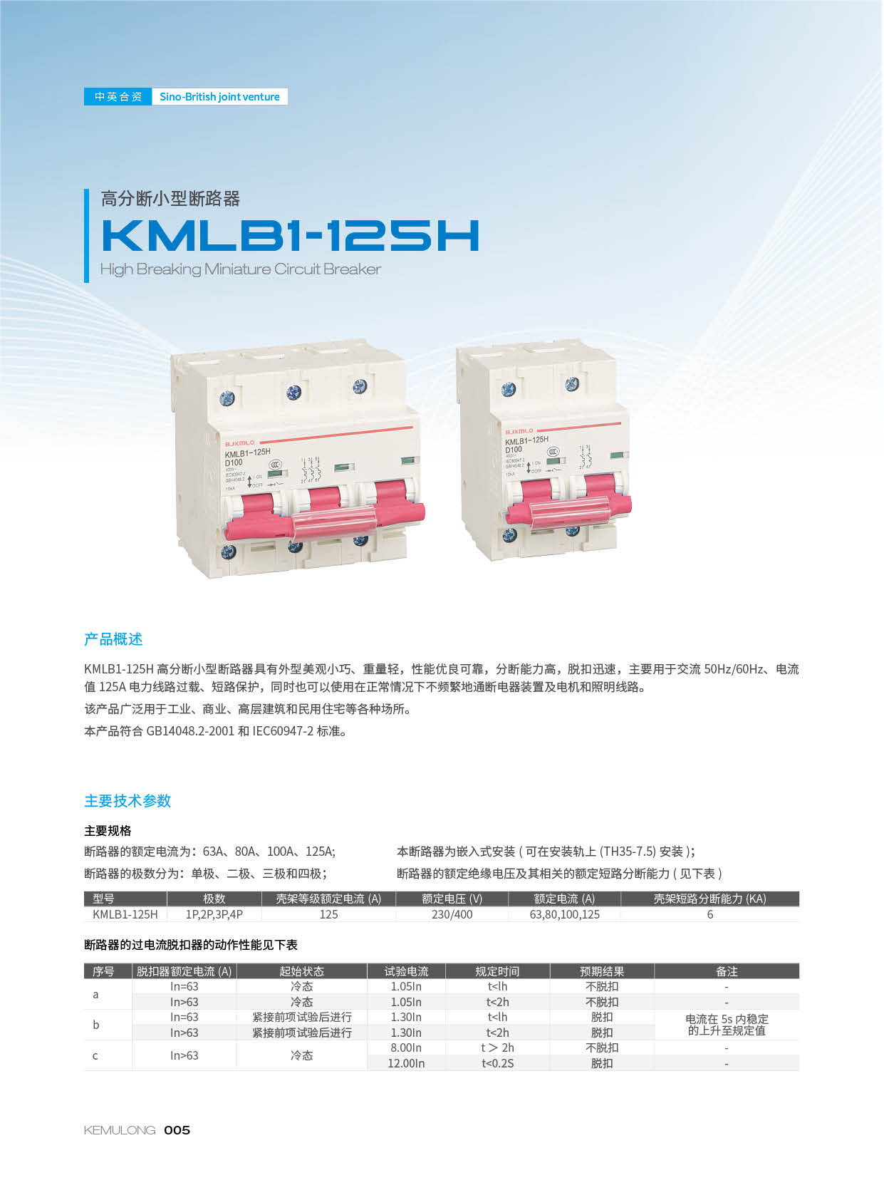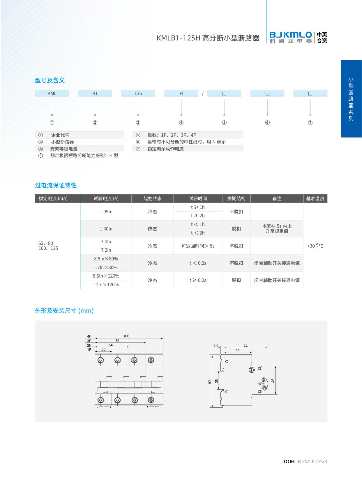KMLB1-125H高分断小型断路器具有外型美观小巧、重量轻,性能优良可靠,分断能力高,脱扣迅速,主要用于交流 50Hz/60Hz、电流值 125A电力线路过载、短路保护,同时也可以使用在正常情况下不频繁地通断电器装置及电机和照明线路。该产品广泛用于工业、商业、高层建筑和民用住宅等各种场所。本产品符合 GB14048.2-2001和IEC60947-2 标准。
