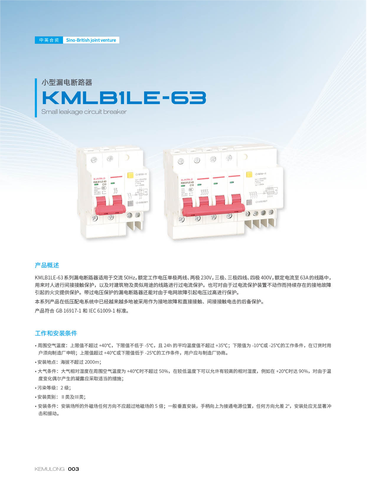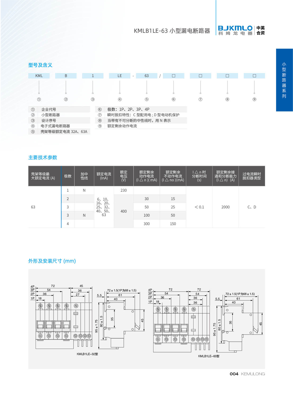 KMLBILE-63系列漏电断路器适用于交流 50Hz,额定工作电压单极两线、两极230V,三极、三板四线、四极400V,额定电流至63A的线路中,用来对人进行间接接触保护,以及对建筑物及类似用途的线路进行过电流保护。也可对由于过电流保护装置不动作而持续存在的接地故障引起的火灾提供保护。带过电压保护的漏电断路器还能对由于电网故障引起电压过高进行保护。本系列产品在低压配电系统中已经越来越多地被采用作为接地故障和直接接触、间接接触电击的后备保护。产品符合 GB 16917-1和IEC61009-1标准。