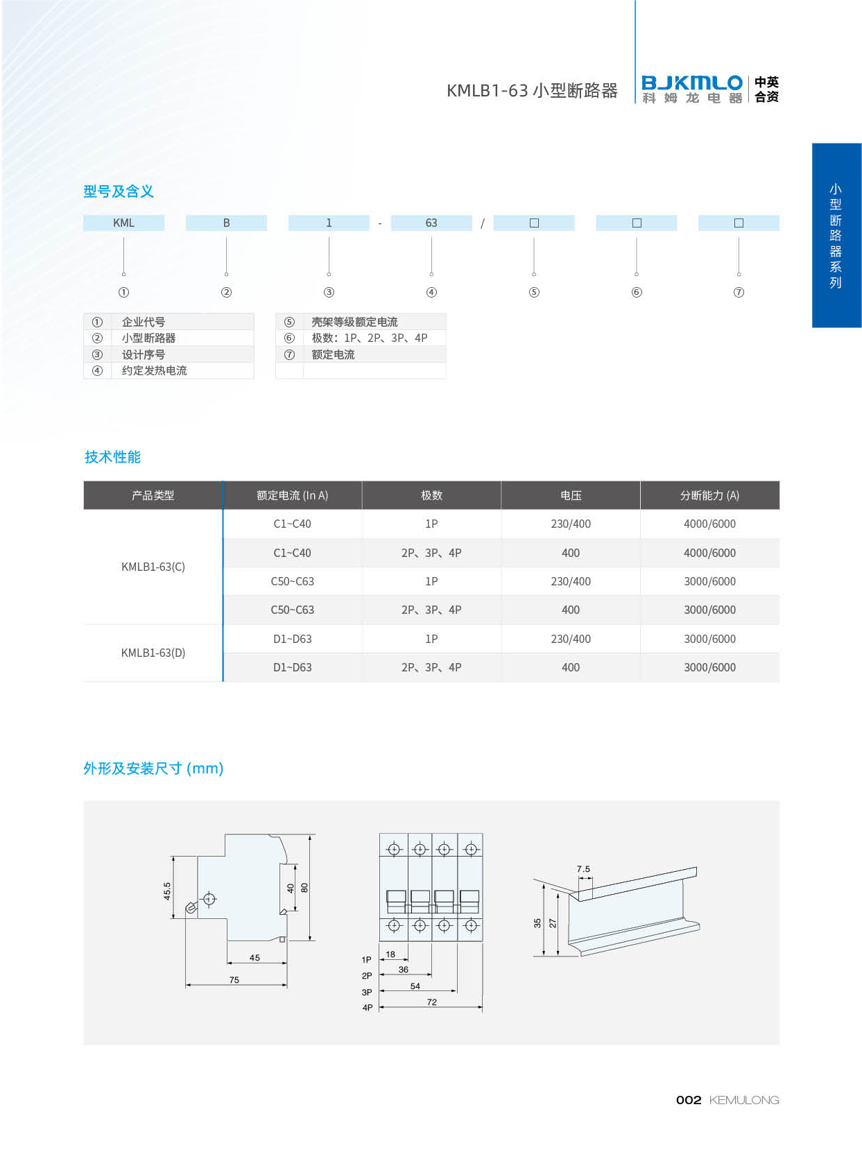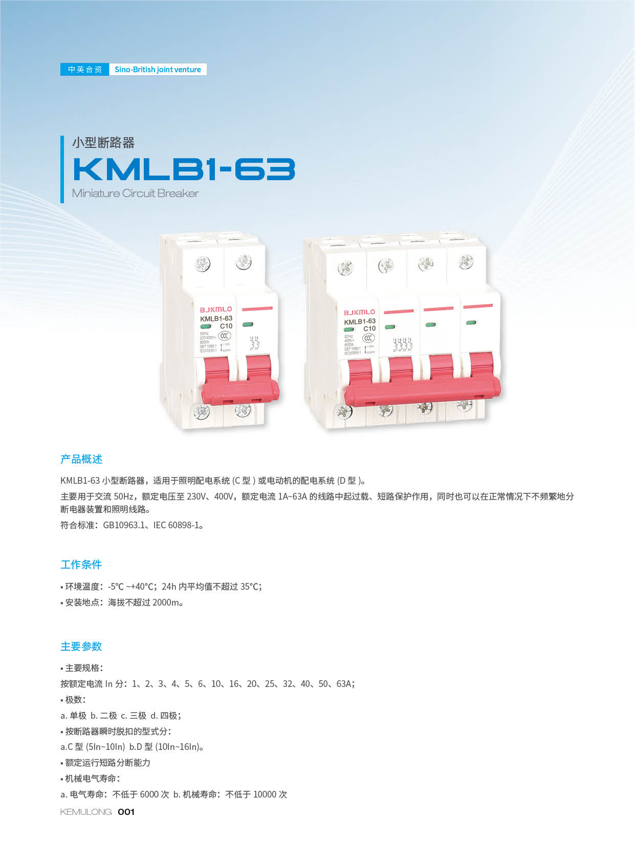 KMLB1-63 小型断路器,适用于照明配电系统(C型)或电动机的配电系统(D型)。主要用于交流 50Hz,额定电压至 230V、400V,额定电流 1A~63A 的线路中起过载、短路保护作用,同时也可以在正常情况下不频繁地分断电器装置和照明线路。