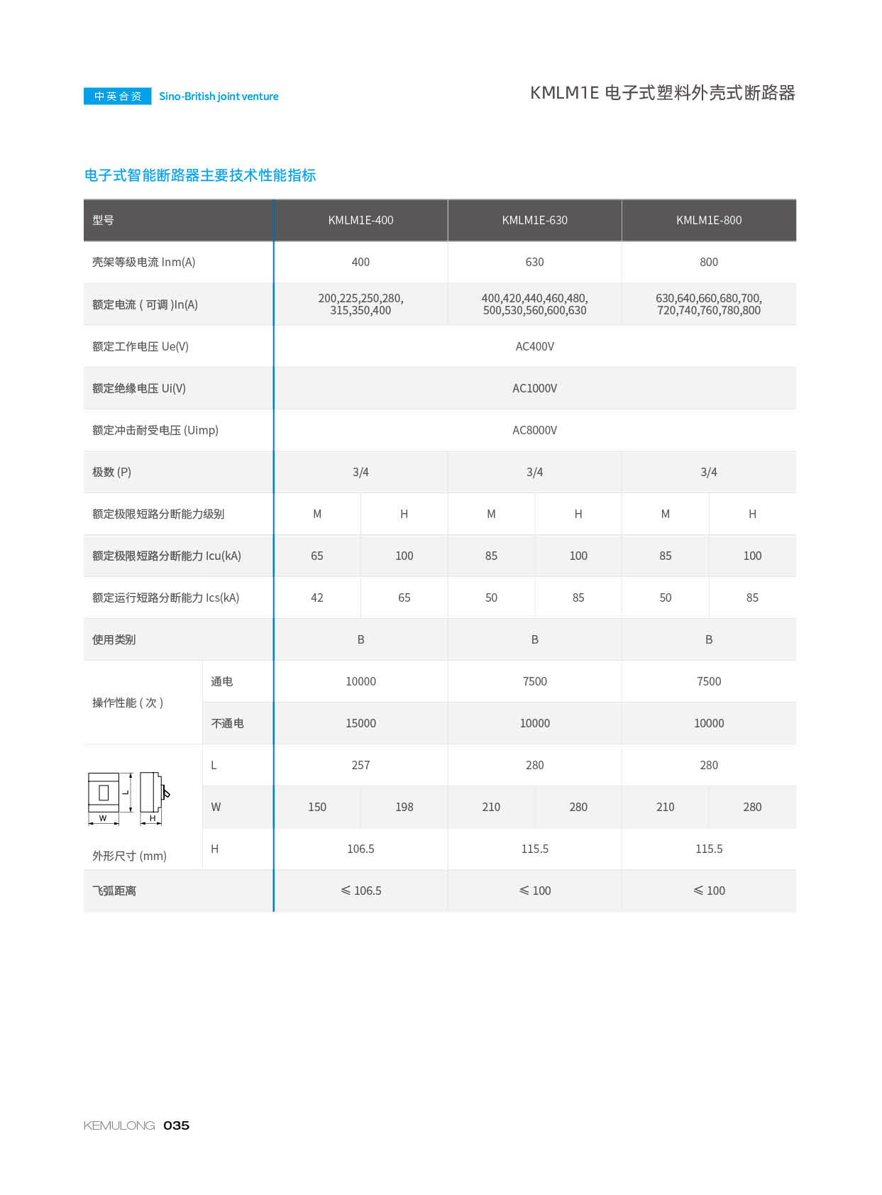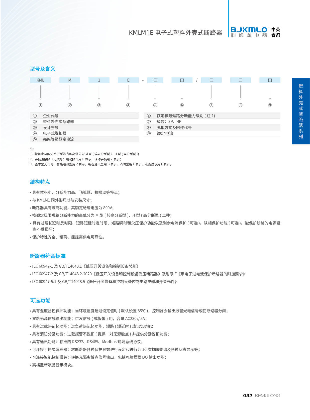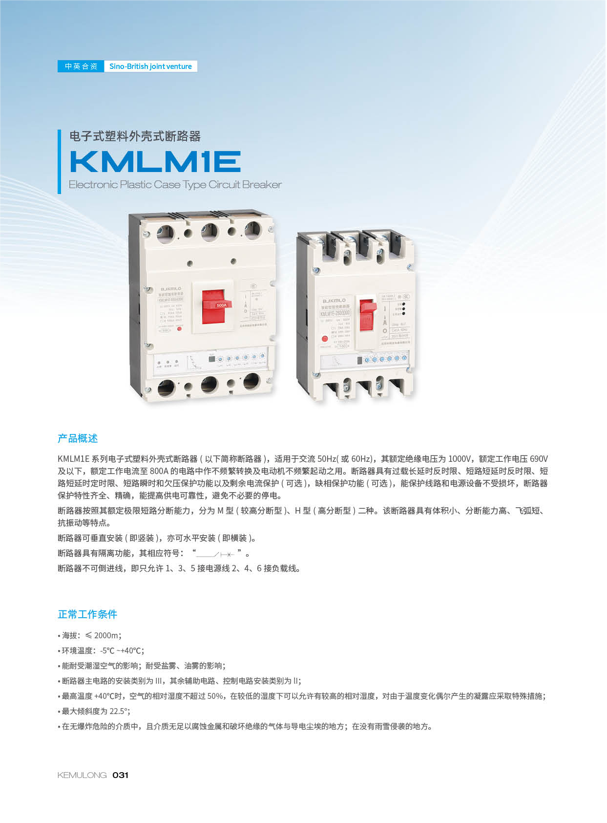 KMLM1E系列电子式塑料外壳式断路器(以下简称断路器),适用于交流 50HZ(或 60Hz),其额定绝缘电压为 1000V,额定工作电压 690V及以下,额定工作电流至 800A的电路中作不频繁转换及电动机不频繁起动之用。断路器具有过载长延时反时限、短路短延时反时限、短路短延时定时限、短路瞬时和欠压保护功能以及剩余电流保护(可选),缺相保护功能(可选),能保护线路和电源设备不受损坏,断路器保护特性齐全、精确,能提高供电可靠性,避免不必要的停电。断路器按照其额定极限短路分断能力,分为M型(较高分断型)、 H型(高分断型)二种。该断路器具有体积小、分断能力高、飞弧短、抗振动等特点。
