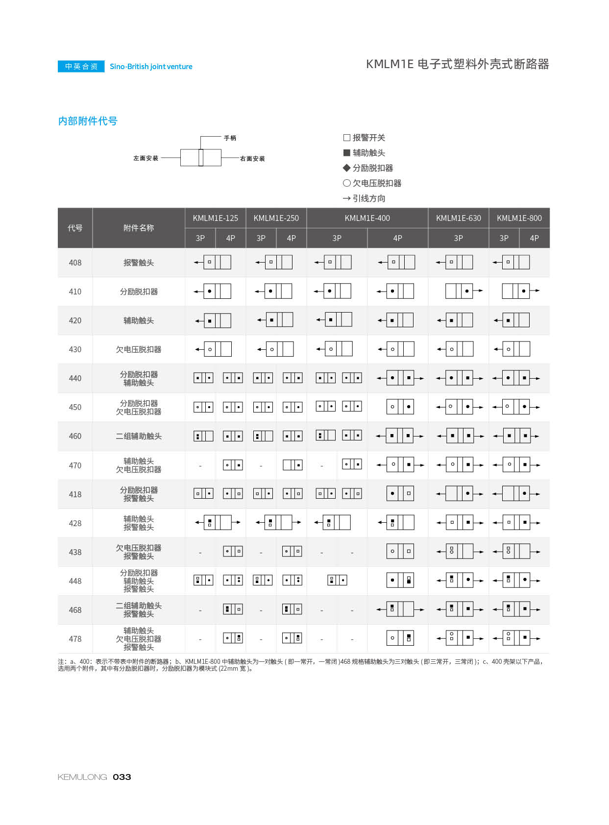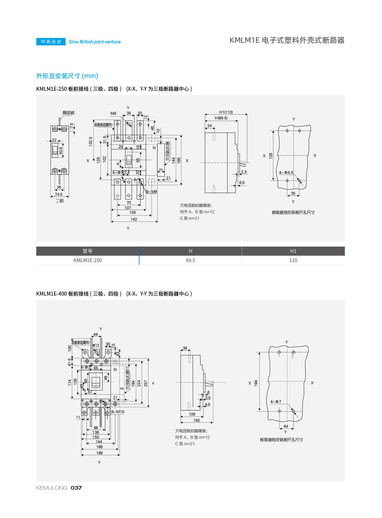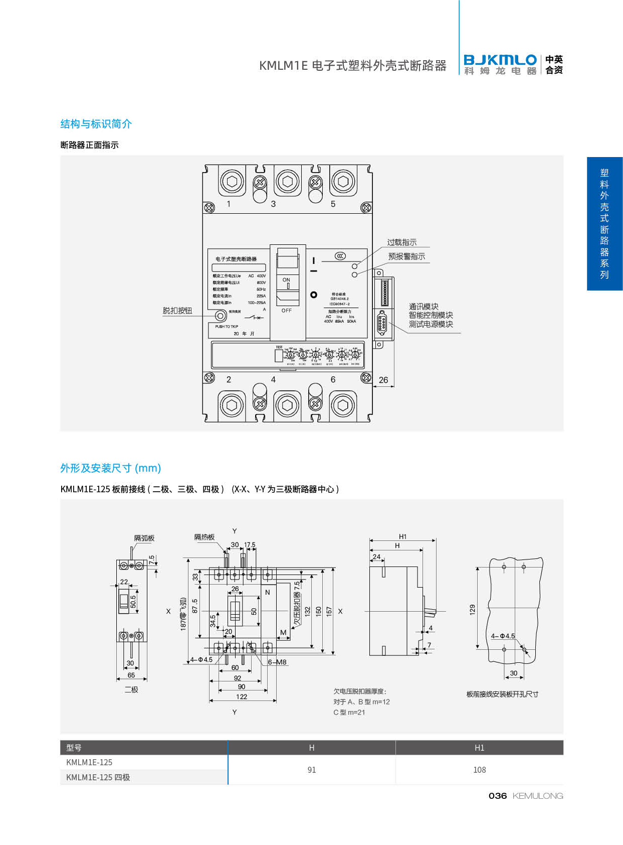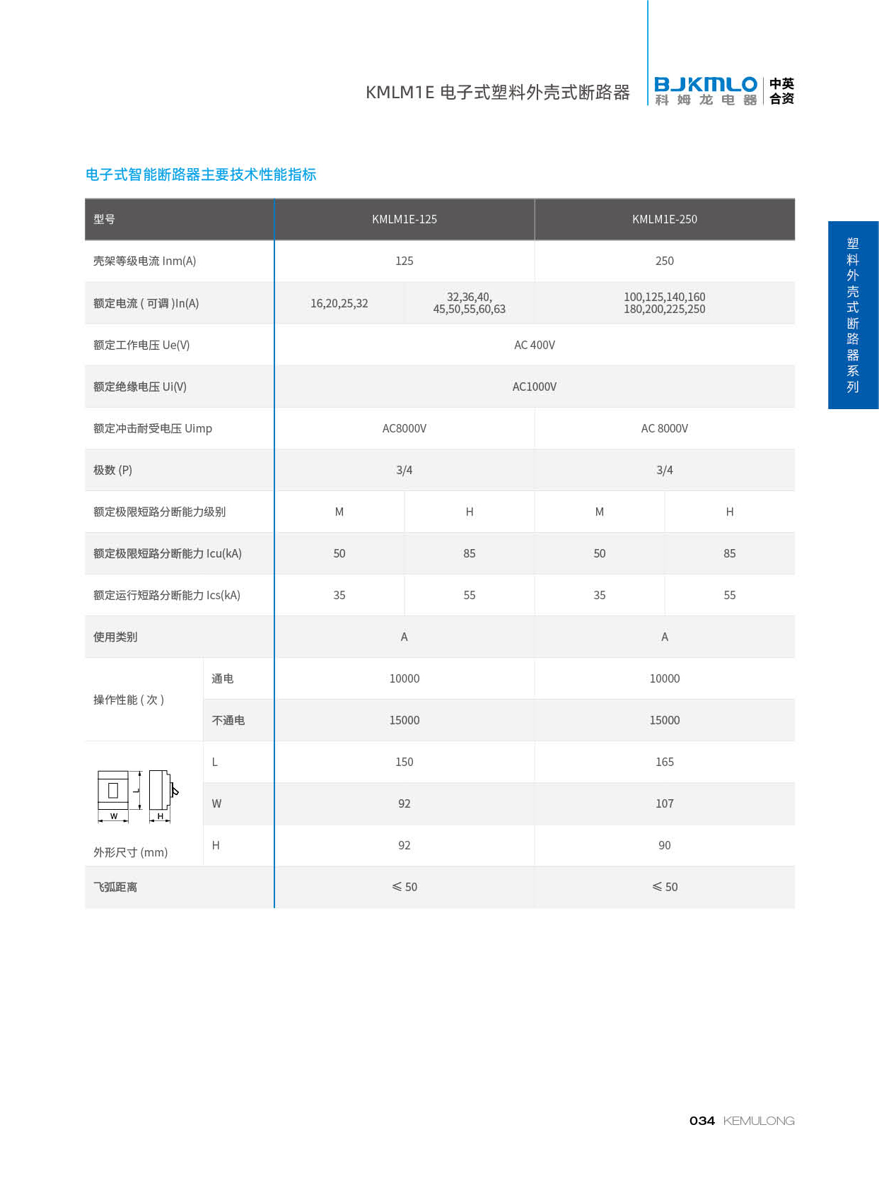 KMLM1E系列电子式塑料外壳式断路器(以下简称断路器),适用于交流 50HZ(或 60Hz),其额定绝缘电压为 1000V,额定工作电压 690V及以下,额定工作电流至 800A的电路中作不频繁转换及电动机不频繁起动之用。断路器具有过载长延时反时限、短路短延时反时限、短路短延时定时限、短路瞬时和欠压保护功能以及剩余电流保护(可选),缺相保护功能(可选),能保护线路和电源设备不受损坏,断路器保护特性齐全、精确,能提高供电可靠性,避免不必要的停电。断路器按照其额定极限短路分断能力,分为M型(较高分断型)、 H型(高分断型)二种。该断路器具有体积小、分断能力高、飞弧短、抗振动等特点。
