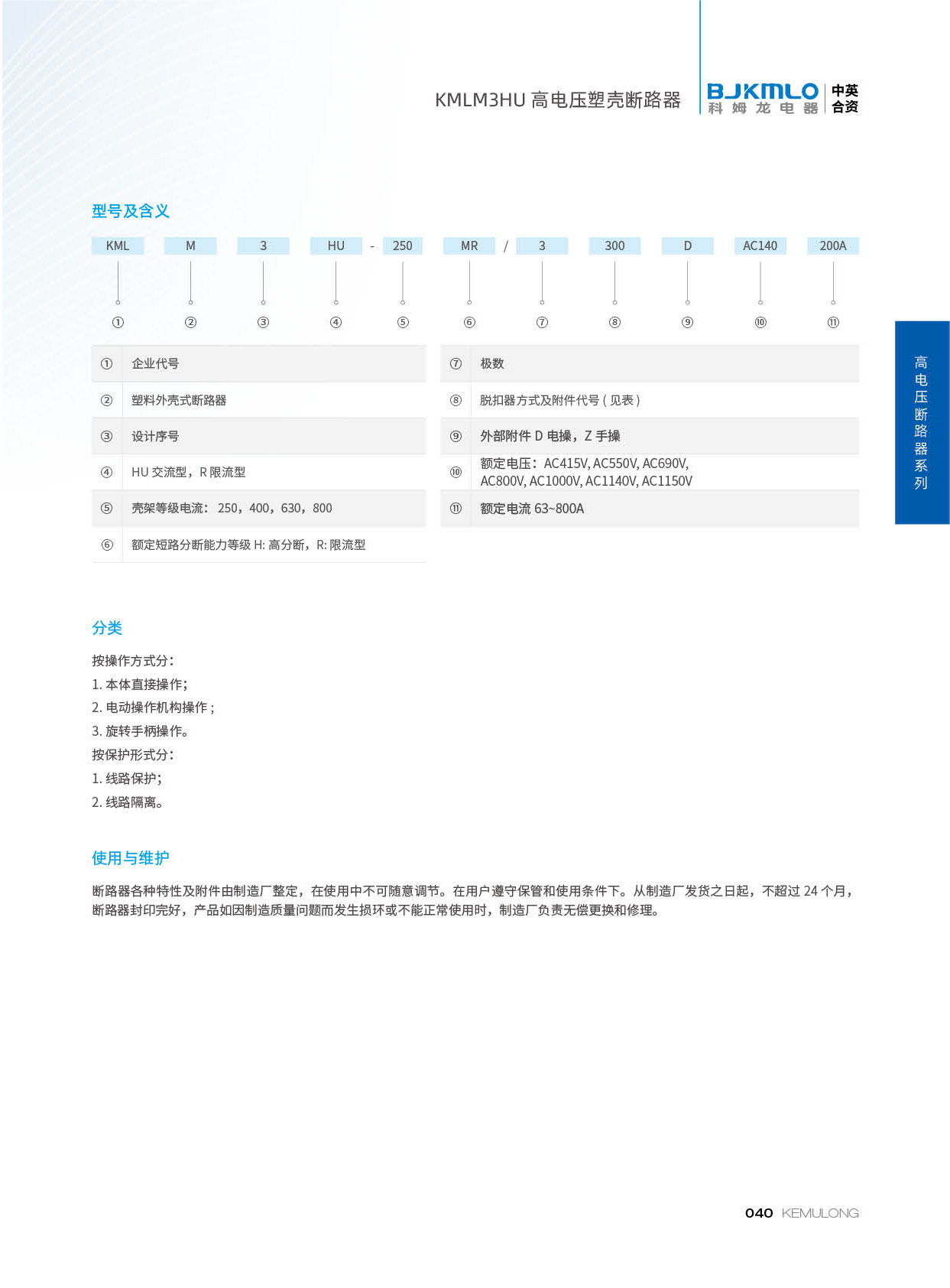 KMLM3HU 系列高电压塑壳断路器,额定工作电压高至 AC1150V,电流高至 800A。