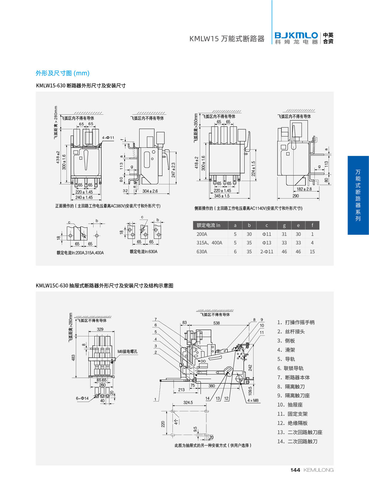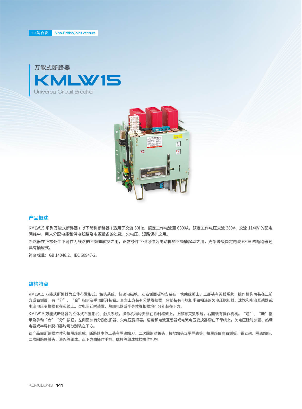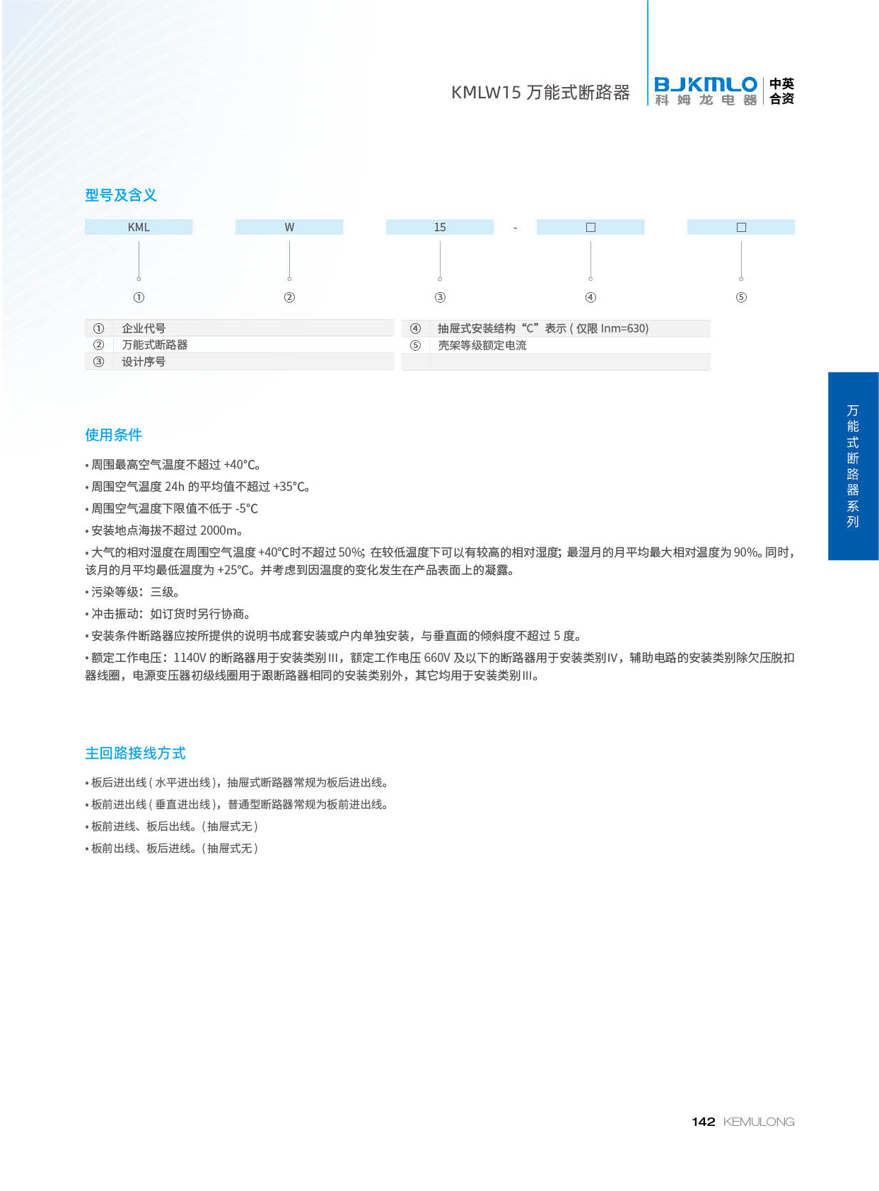 KMLW15系列万能式断路器(以下简称断路器)适用于交流 50Hz、额定工作电流至 6300A,额定工作电压交流 380V、交流 1140V 的配电网络中,用来分配电能和供电线路及电源设备的过载、欠电压、短路保护之用。