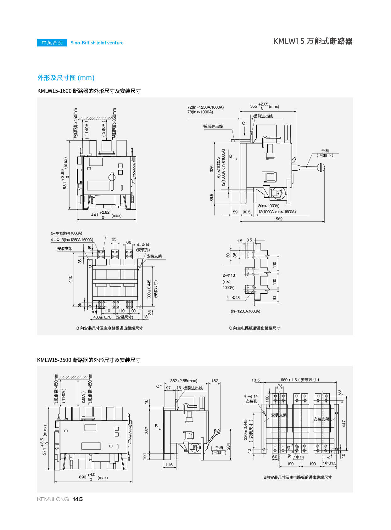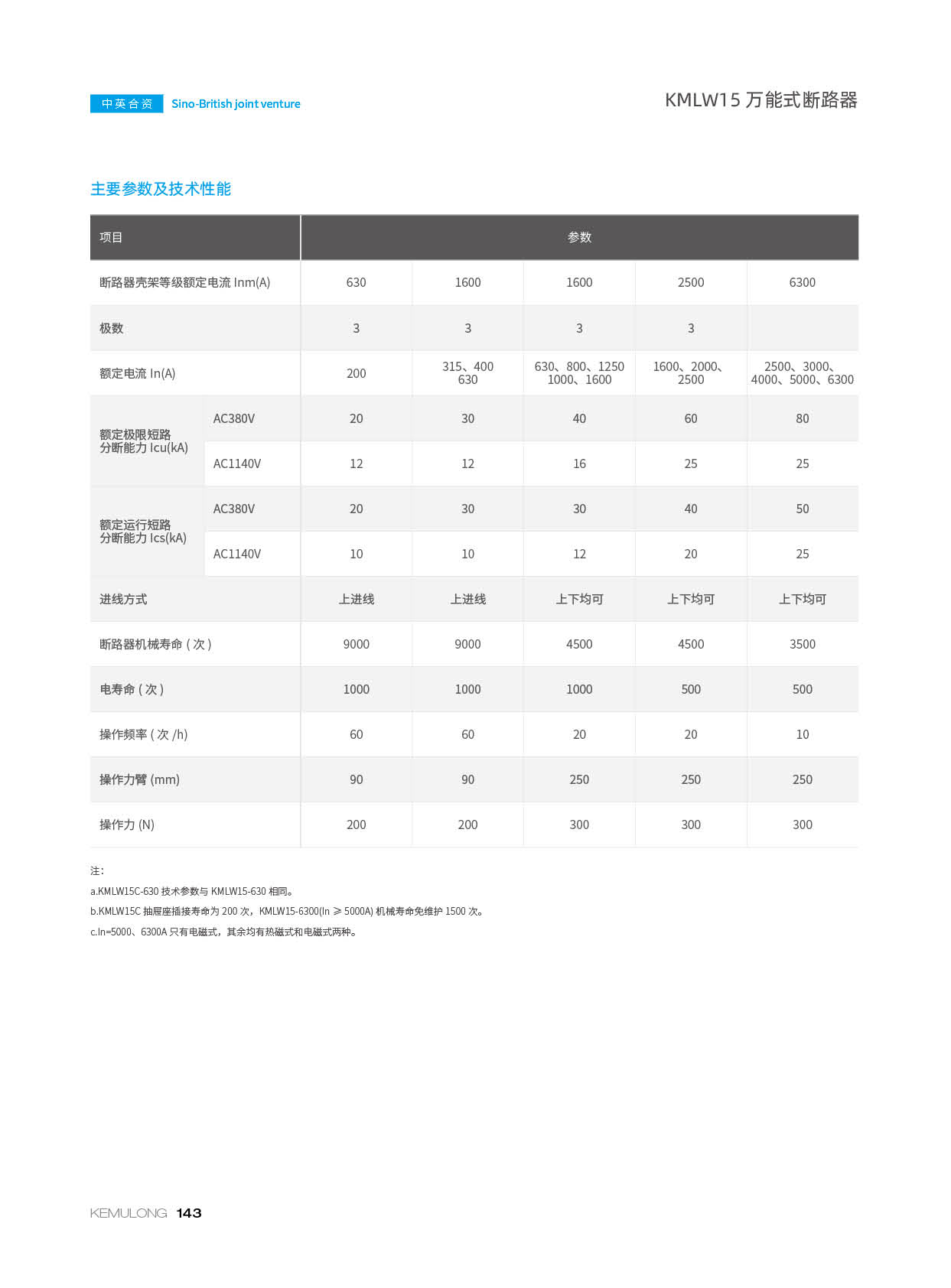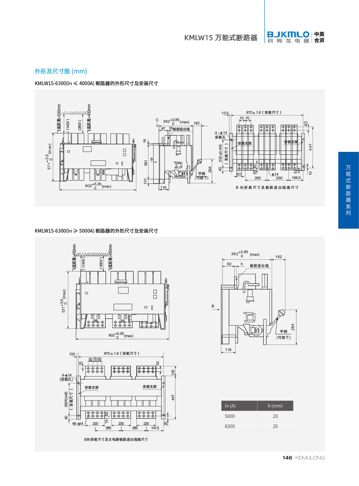 KMLW15系列万能式断路器(以下简称断路器)适用于交流 50Hz、额定工作电流至 6300A,额定工作电压交流 380V、交流 1140V 的配电网络中,用来分配电能和供电线路及电源设备的过载、欠电压、短路保护之用。