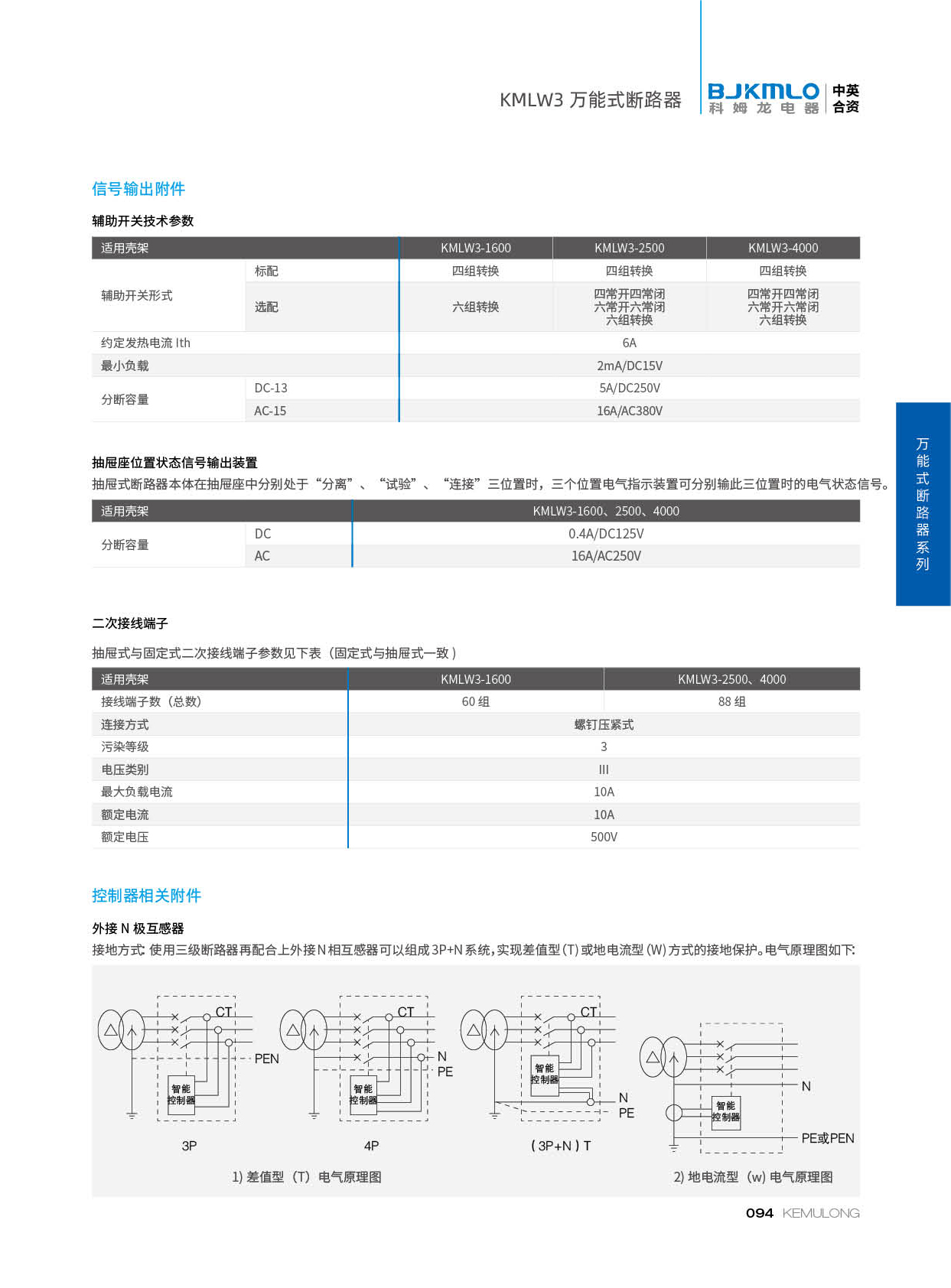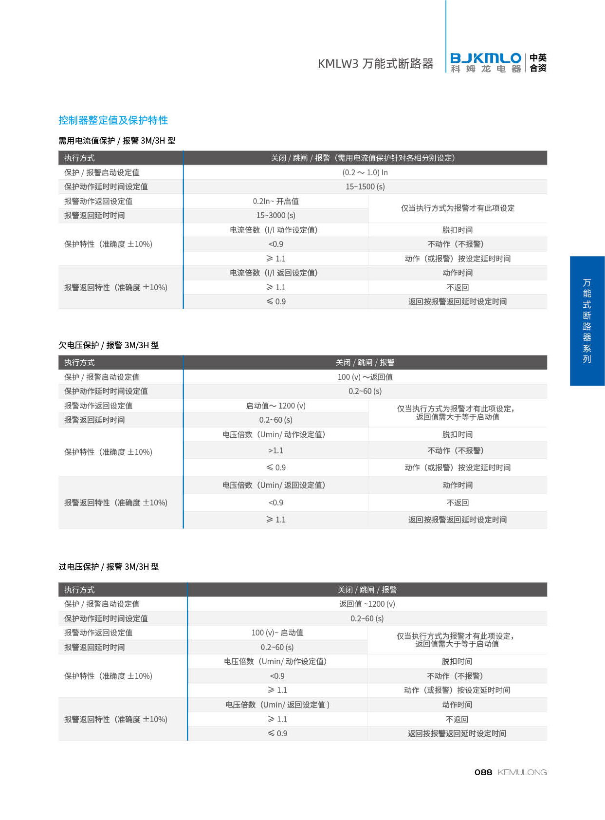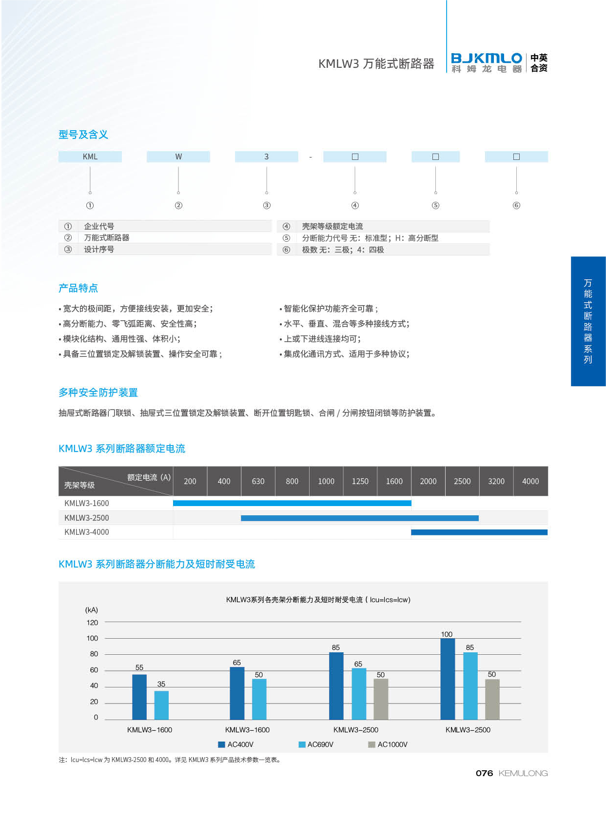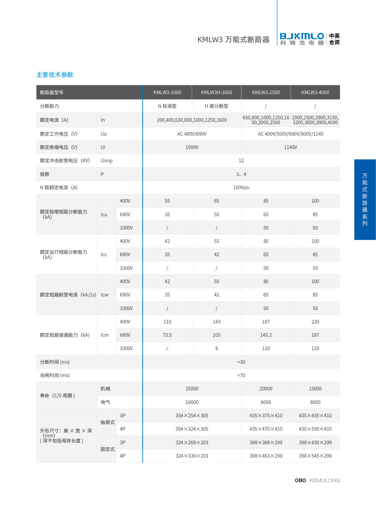 KMLW3 系列万能式断路器,适用干交流50Hz、额定电流 200A-4000A、额定绝缘电压1140V、额定工作电压AC400V/AC690V/AC1140V的配电网络中,用来分配电能和保护线路及电源设备免受过载、欠电压、短路、单相接地等故障的危害。同时也具有隔离功能。断路器具有 多种保护功能,高精确的选择性保护,提高了供电可靠性。
