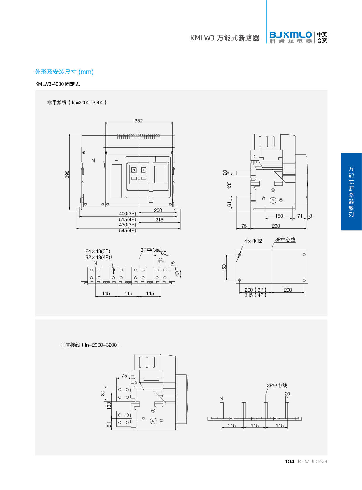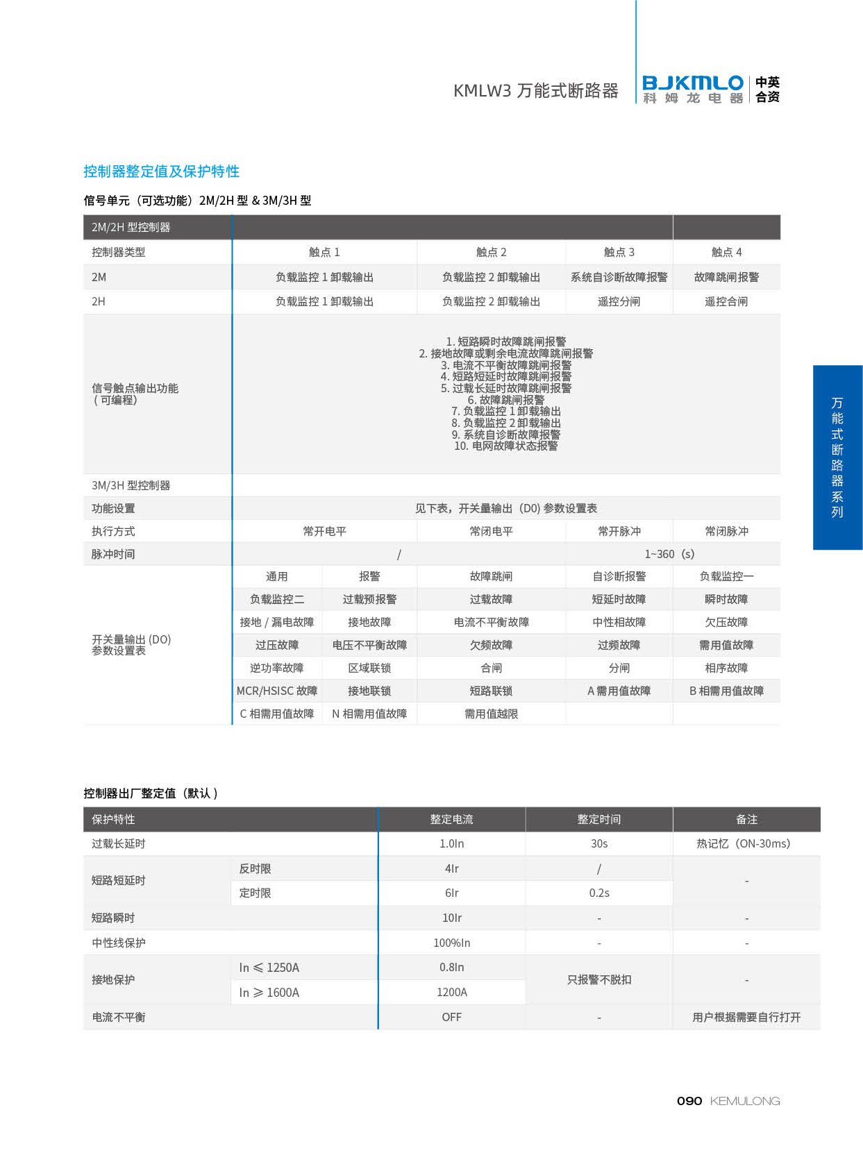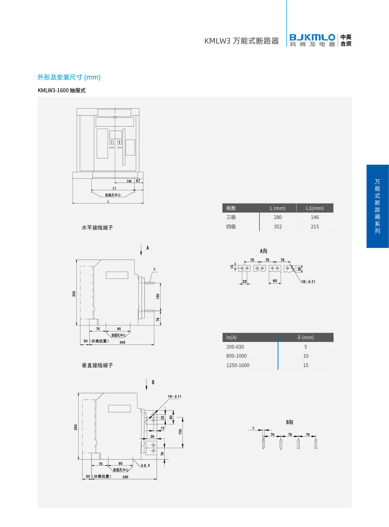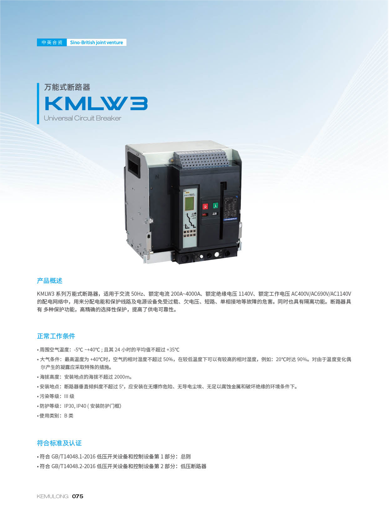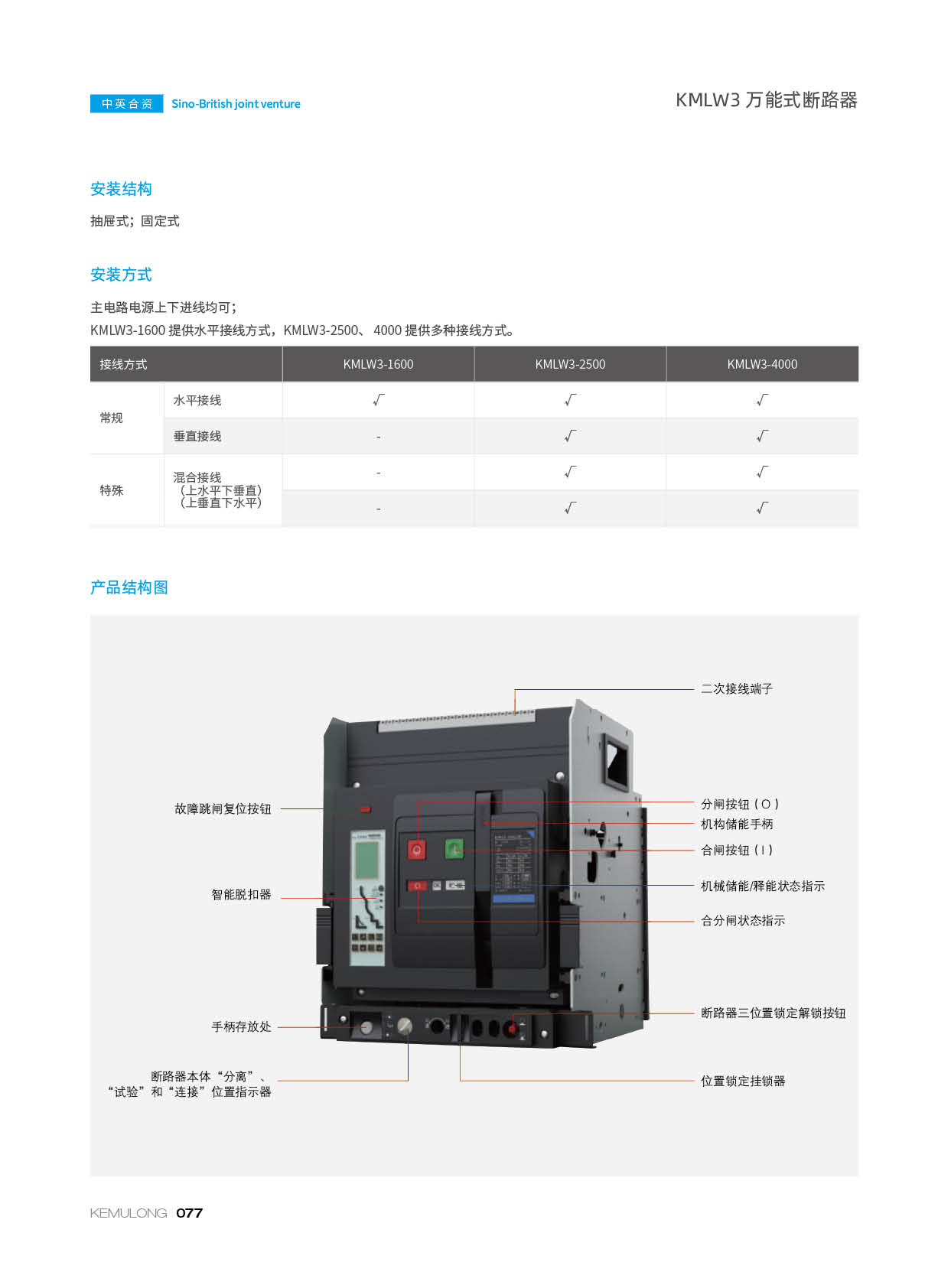 KMLW3 系列万能式断路器,适用干交流50Hz、额定电流 200A-4000A、额定绝缘电压1140V、额定工作电压AC400V/AC690V/AC1140V的配电网络中,用来分配电能和保护线路及电源设备免受过载、欠电压、短路、单相接地等故障的危害。同时也具有隔离功能。断路器具有 多种保护功能,高精确的选择性保护,提高了供电可靠性。