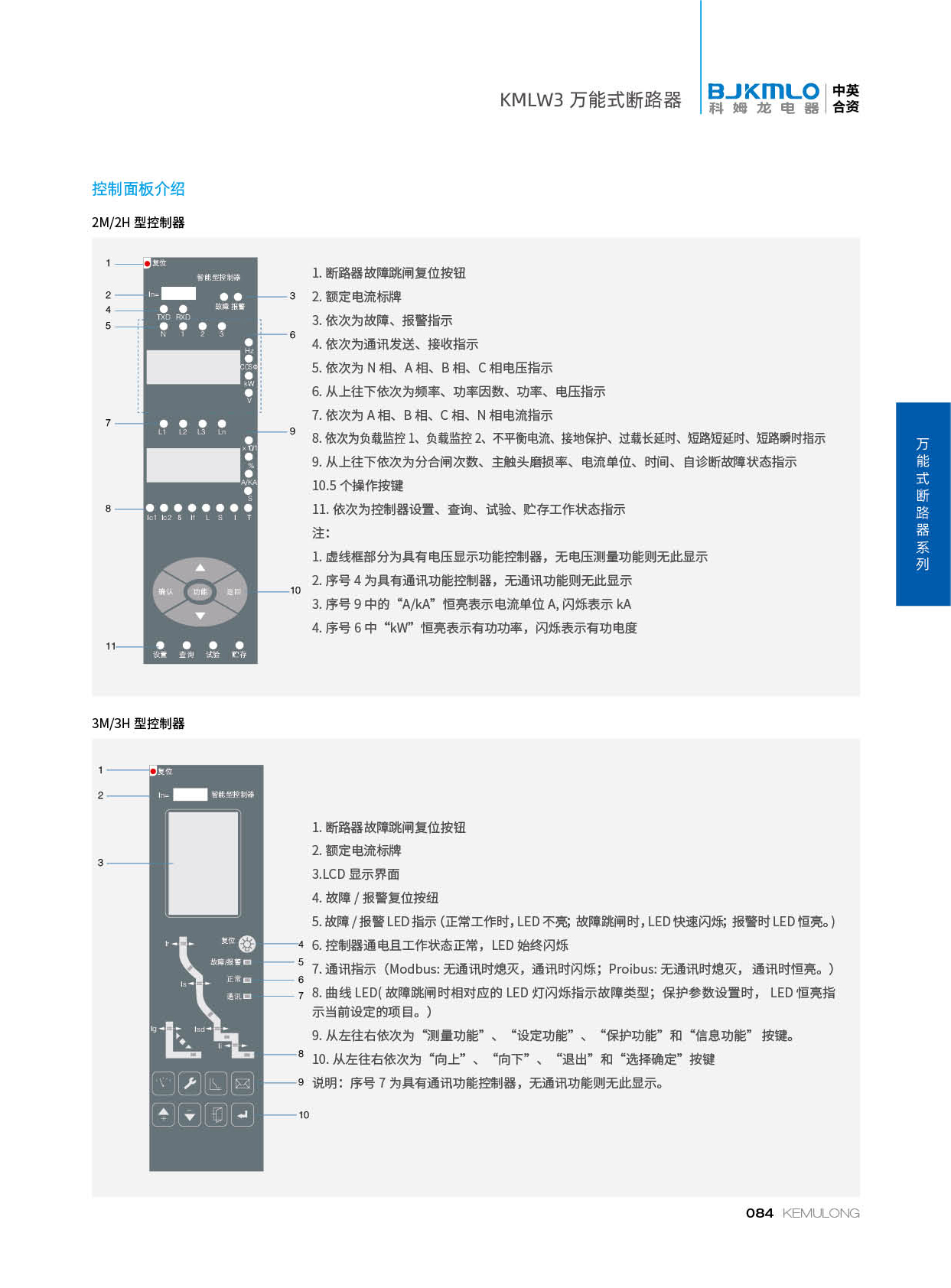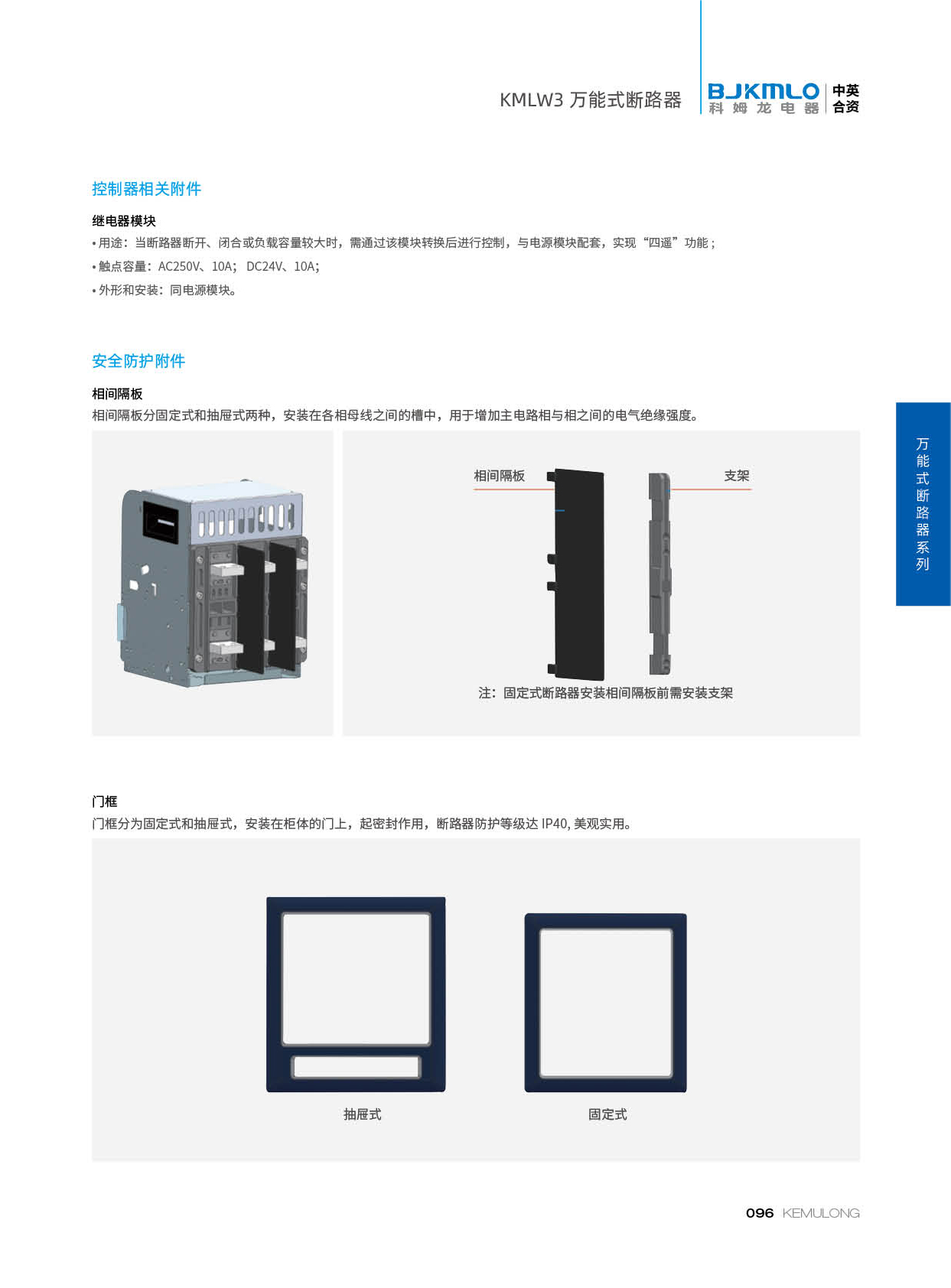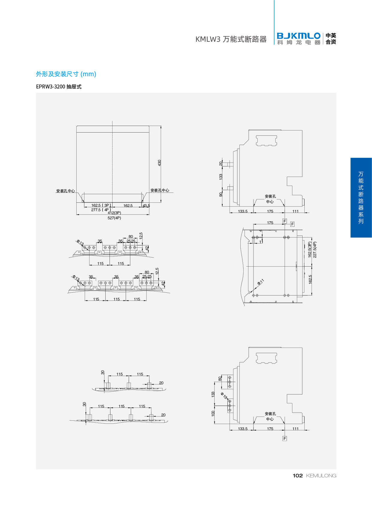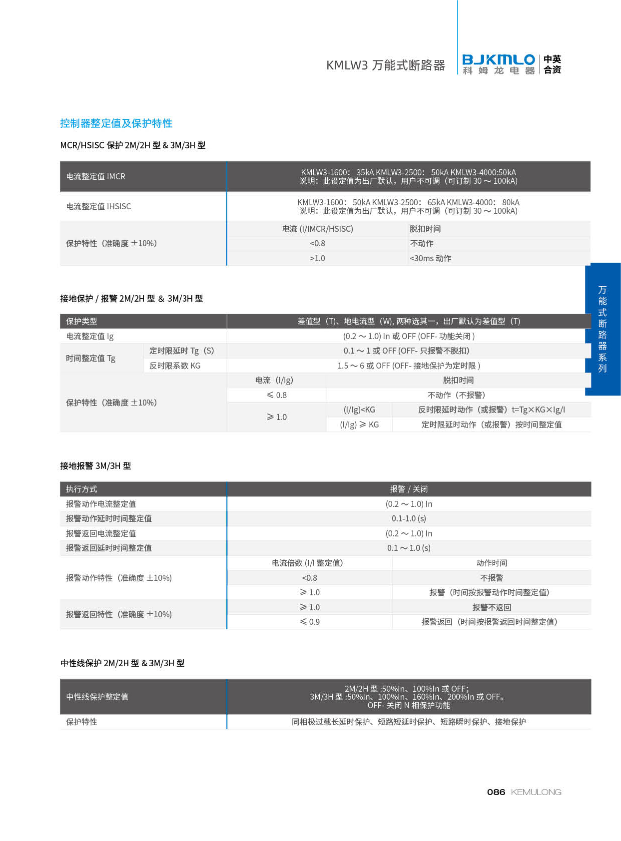 KMLW3 系列万能式断路器,适用干交流50Hz、额定电流 200A-4000A、额定绝缘电压1140V、额定工作电压AC400V/AC690V/AC1140V的配电网络中,用来分配电能和保护线路及电源设备免受过载、欠电压、短路、单相接地等故障的危害。同时也具有隔离功能。断路器具有 多种保护功能,高精确的选择性保护,提高了供电可靠性。