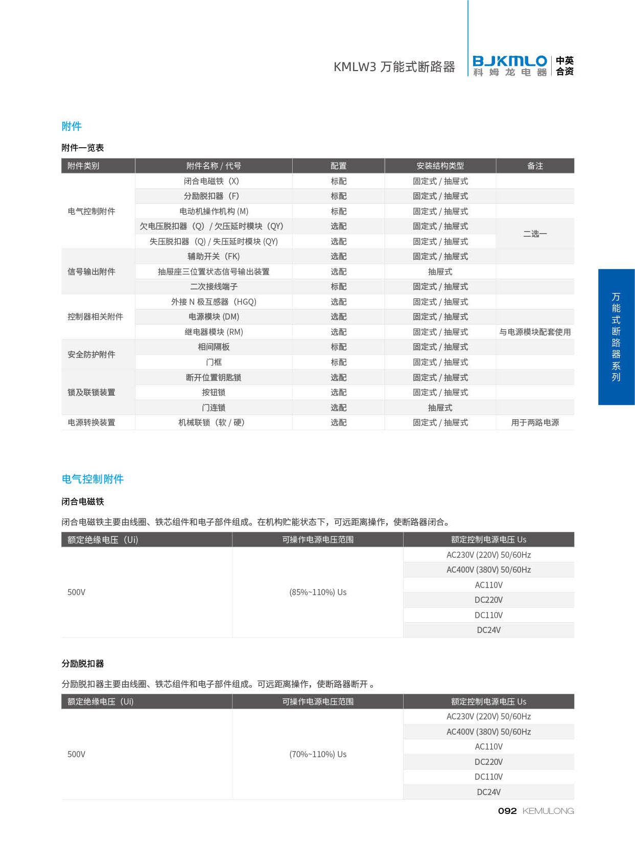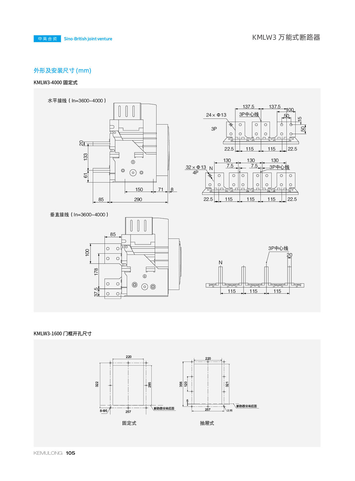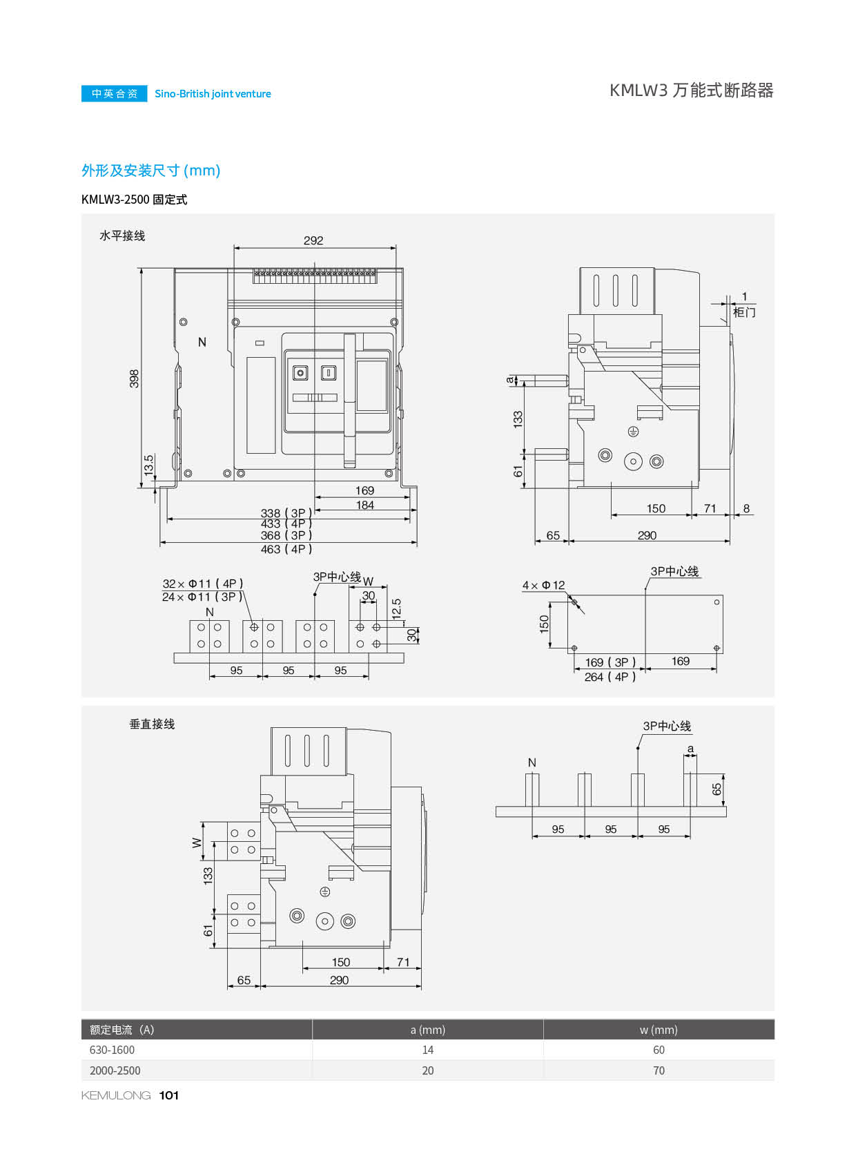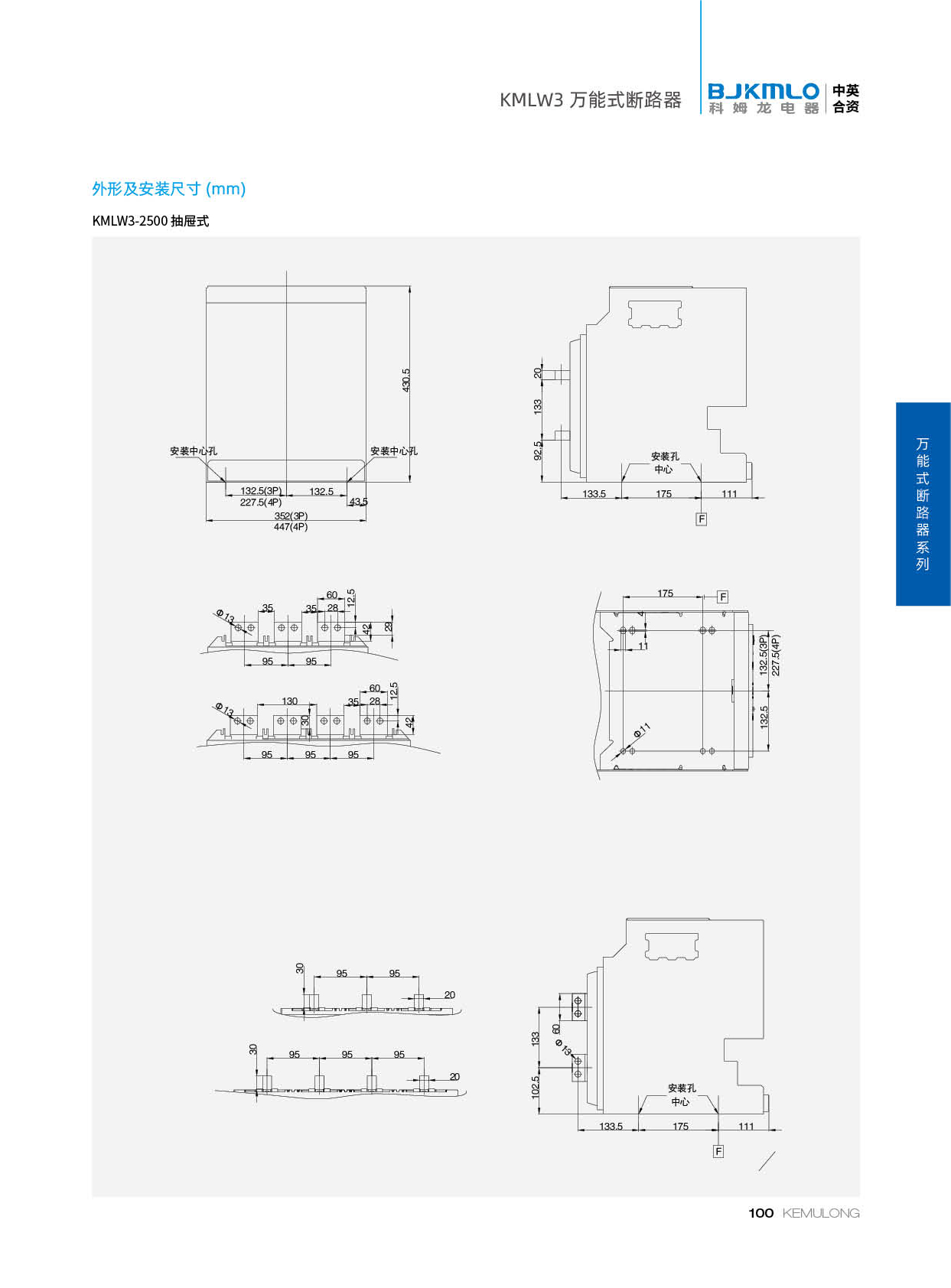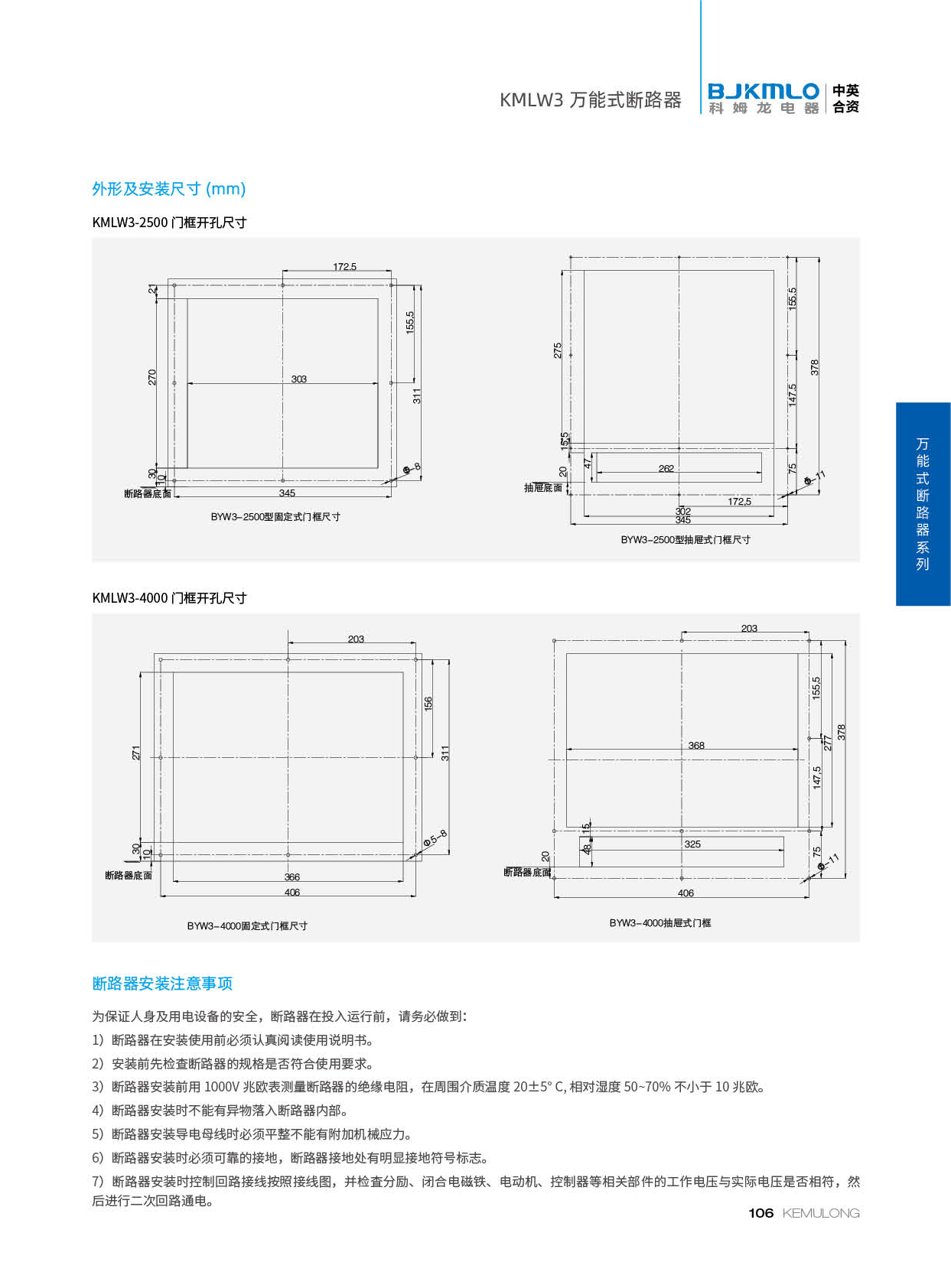 KMLW3 系列万能式断路器,适用干交流50Hz、额定电流 200A-4000A、额定绝缘电压1140V、额定工作电压AC400V/AC690V/AC1140V的配电网络中,用来分配电能和保护线路及电源设备免受过载、欠电压、短路、单相接地等故障的危害。同时也具有隔离功能。断路器具有 多种保护功能,高精确的选择性保护,提高了供电可靠性。