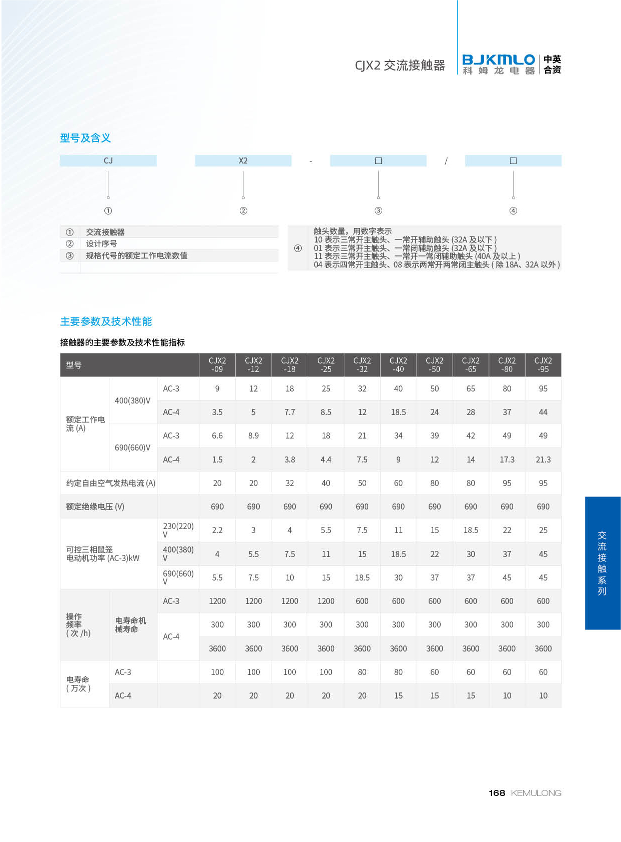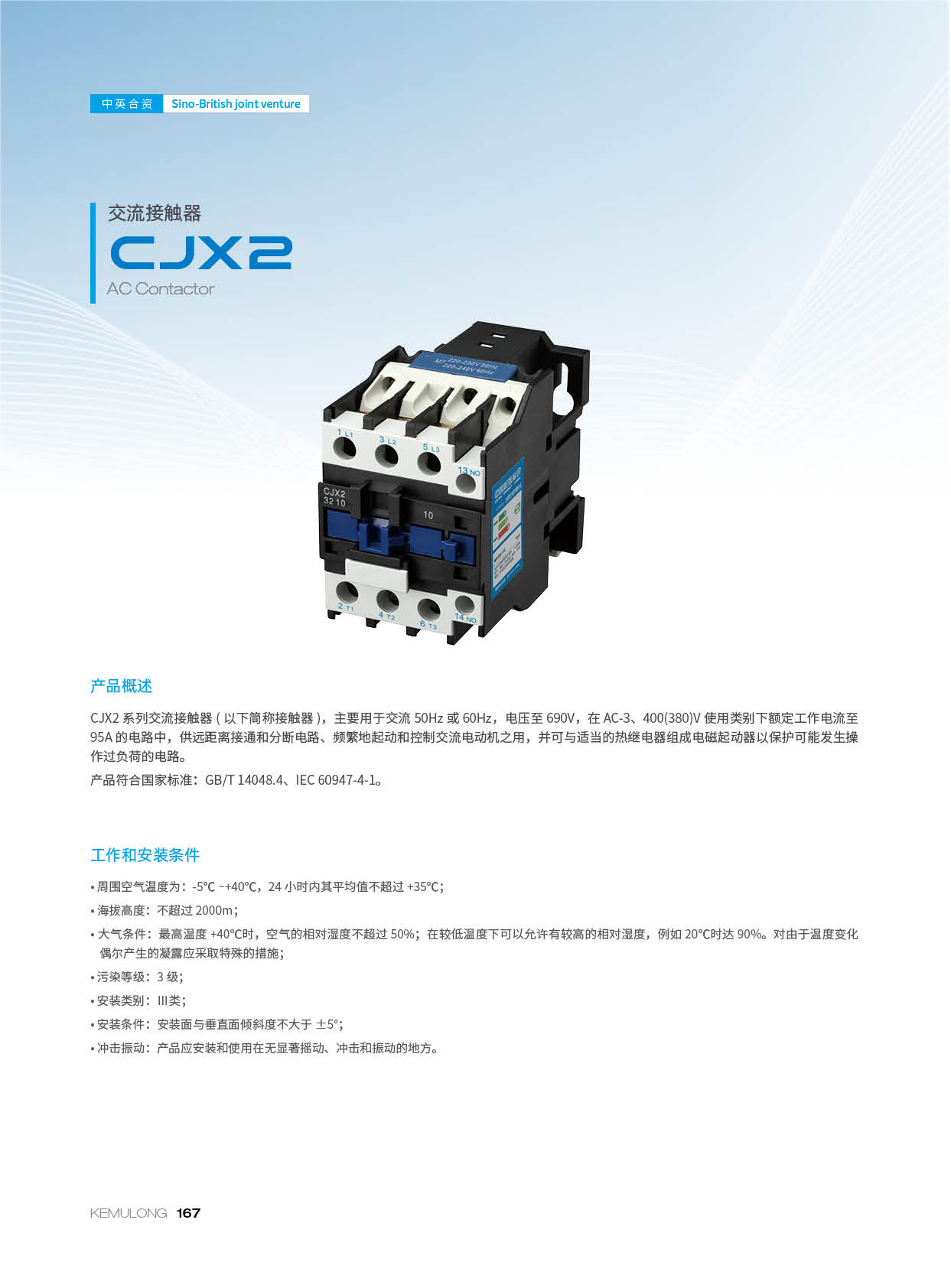 CJX2系列交流接触器(以下简称接触器),主要用于交流 50Hz或60HZ,电压至690V,在AC-3、400(380)V使用类别下额定工作电流至95A的电路中,供远距离接通和分断电路、频繁地起动和控制交流电动机之用,并可与适当的热继电器组成电磁起动器以保护可能发生操作过负荷的电路。