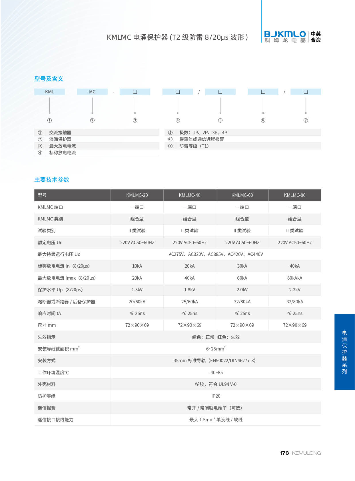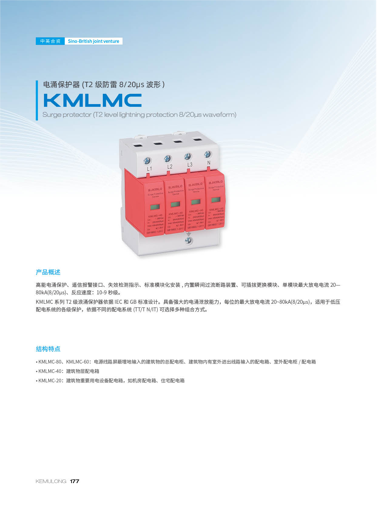 KMLMC 系列T2 级浪涌保护器依据 IEC和 GB 标准设计。具备强大的电涌泄放能力,每位的最大放电电流20-80KA(8/20us),适用于低压配电系统的各级保护,依据不同的配电系统(TT/TN/IT)可选择多种组合方式。