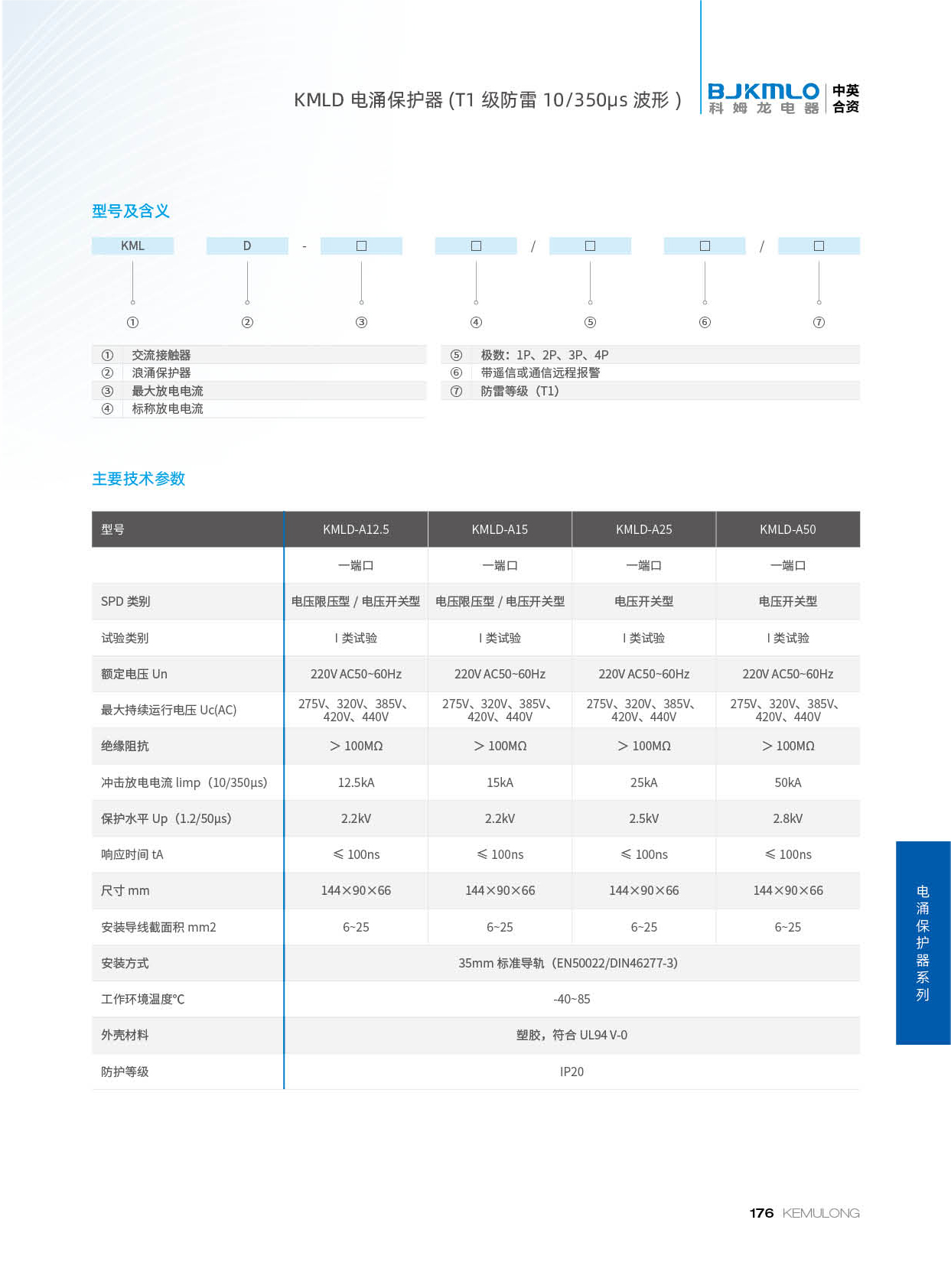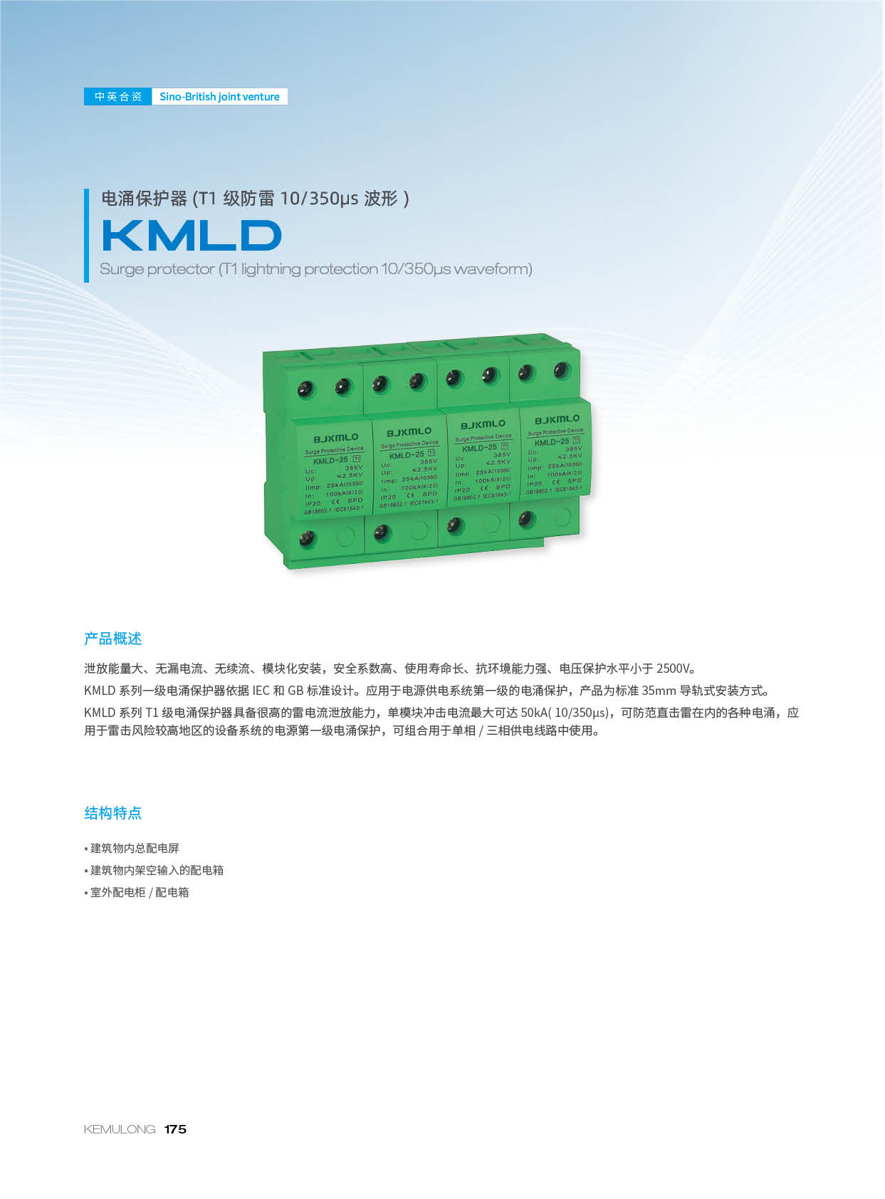 KMLD 系列一级电涌保护器依据 IEC和 GB 标准设计。应用于电源供电系统第一级的电涌保护,产品为标准 35mm 导轨式安装方式。