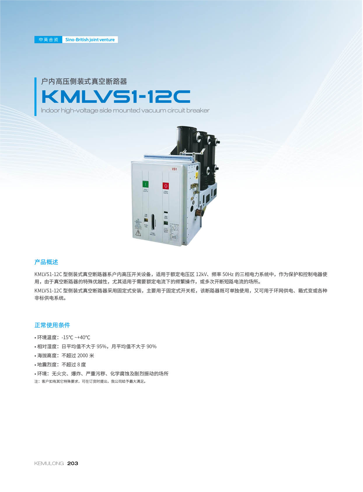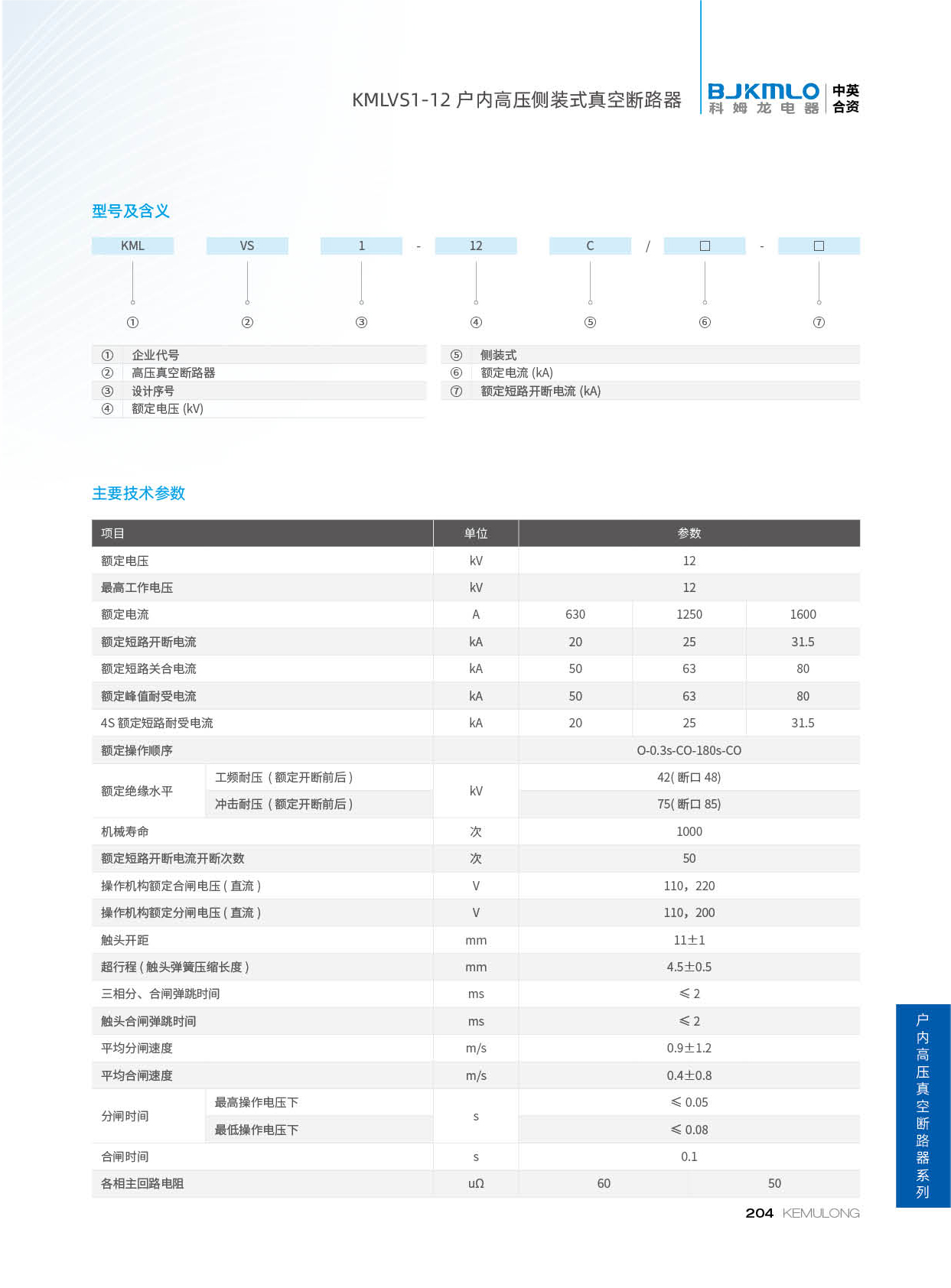 KMLVS1-12C型侧装式真空断路器系户内高压开关设备,适用于额定电压区12kV、频率50Hz的三相电力系统中,作为保护和控制电器使用,由于真空断路器的特殊优越性,尤其适用于需要额定电流下的频繁操作,或多次开断短路电流的场所。