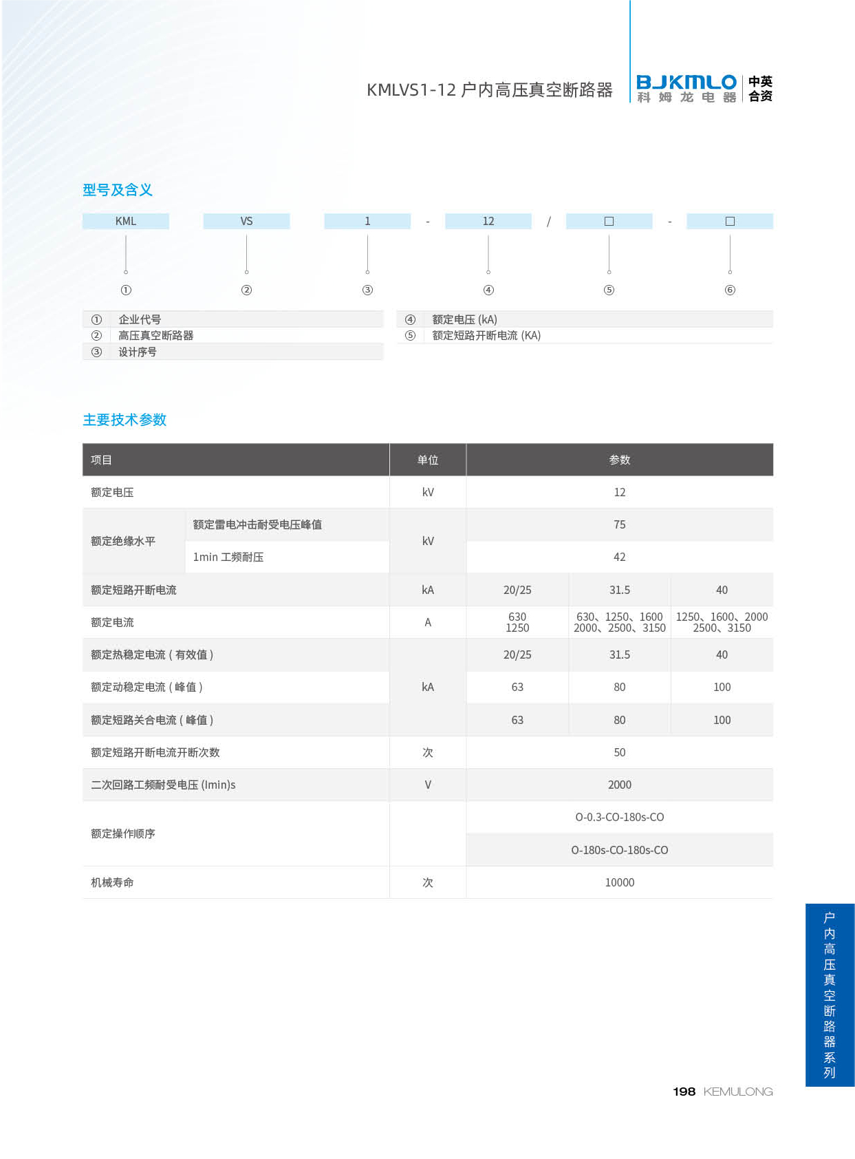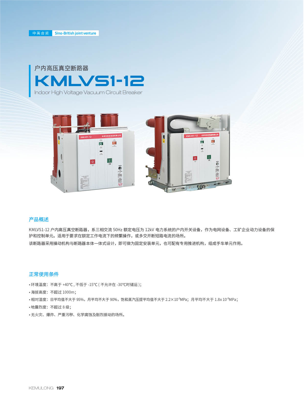 KMLVS1-12户内高压真空断路器,系三相交流50Hz额定电压为12kV电力系统的户内开关设备,作为电网设备、工矿企业动力设备的保护和控制单元。适用于要求在额定工作电流下的频繁操作,或多交开断短路电流的场所。